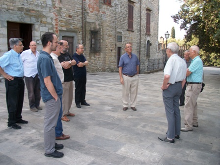 Magnífico recibimiento en ese viaje de los exalumnos de Milani en su primera parroquia, Calenzano (18.7.2013): Javi Álvarez en primer plano, seguido de Alfonso y Veredas y el párroco actual. Detrás, Alfonso (de Prato) y Luigi Cerbai. (A la derecha:) Maresco Ballini y Teopisto. (Foto de Tomás Santiago)
